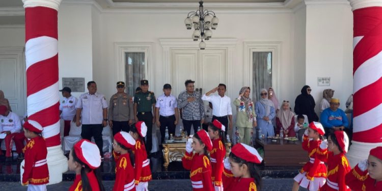 SIDRAP, MERPOS – Bertempat di Rumah Jabatan (Rujab) Bupati Sidrap, Bupati Sidenreng Rappang (Sidrap) Syaharuddin Alrif bersama Sekretaris Daerah, Andi Rahmat Saleh menerima penghormatan dari peserta gerak jalan tingkat Kecamatan Maritengngae dalam rangka memperingati Hari Ulang Tahun (HUT) ke-80 Republik Indonesia, Rabu (13/8/2025).