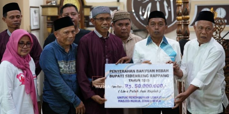 SIDRAP, MERPOS – Bupati Sidenreng Rappang (Sidrap) Syaharuddin Alrif menyerahkan bantuan hibah kepada Pengurus Masjid Nurul Jihad, Kelurahan Wala, Kecamatan Maritengngae, Jumat (2/1/2026). Bantuan senilai Rp50 juta tersebut diperuntukkan untuk penimbunan lokasi pembangunan fasilitas masjid.