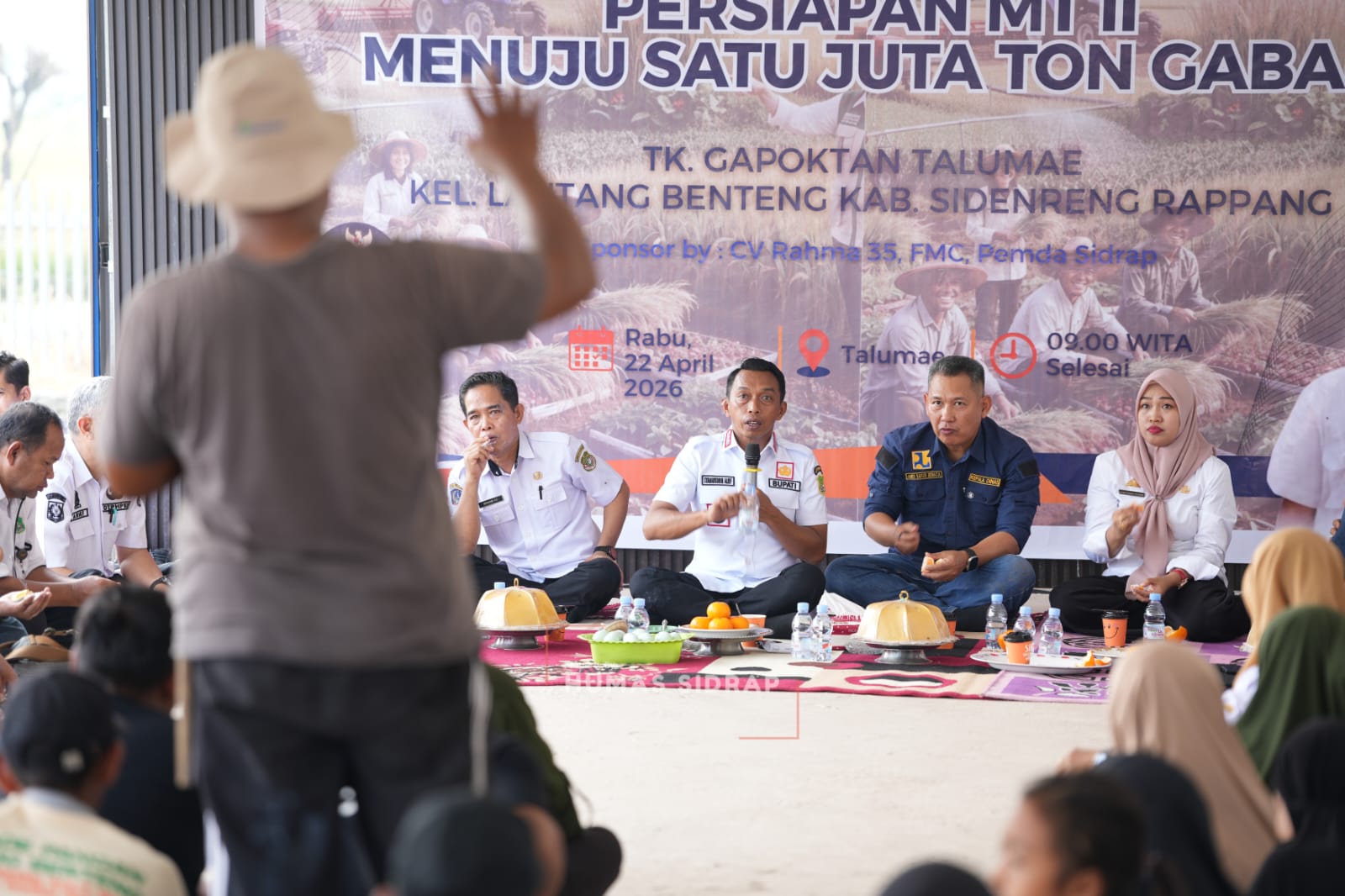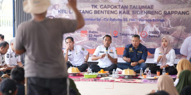 SIDRAP, MERPOS – Bupati Sidenreng Rappang (Sidrap) Syaharuddin Alrif menghadiri tudang sipulung mempersiapkan musim tanam (MT) II guna mendukung pencapaian target produksi 1 juta ton gabah di Kolam Ikan Andi Ato, Talumae, Kelurahan Lautang Benteng, Kecamatan Maritengngae, Rabu (22/4/2026).