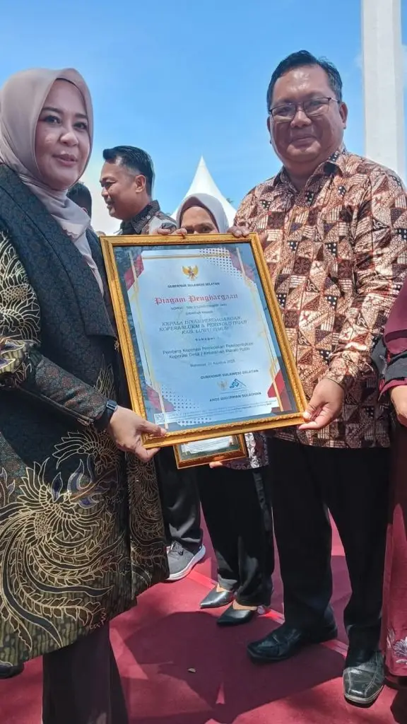 LUTIM, MERPOS– Kadis Disdagkop dan UKM Luwu Timur Senfry Oktavianus menerima Piagam Penghargaan percepatan pembentukan Koperasi Merah Putih, di tingkat Desa dan Kelurahan di Jenneponto, Minggu (24/8/2025).