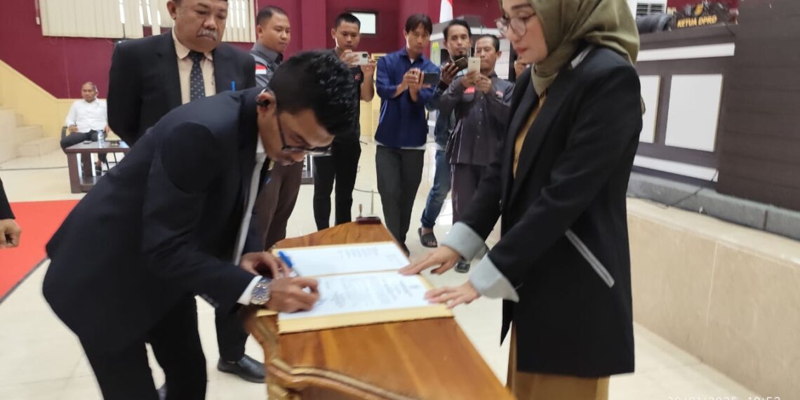 Dalam rapat paripurna ini dilakukan penandatanganan berita acara serta penyerahan Ranperda, oleh Bupati Pasangkayu diwakili Sekretaris Daerah, para Ketua Fraksi dan Sekretaris DPRD Pasangkayu. (AHMAD ZULDI/MERPOS)