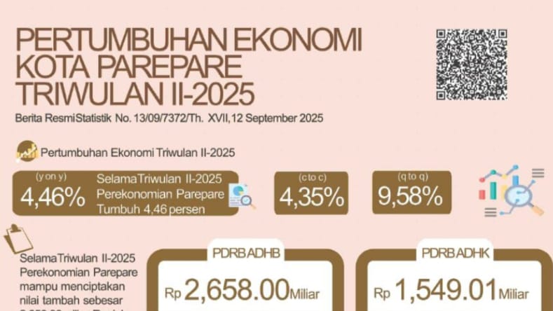 PAREPARE, MERPOS – Perekonomian Kota Parepare menunjukkan perkembangan yang menggembirakan. Badan Pusat Statistik (BPS) Kota Parepare mencatat, pada Triwulan II-2025 perekonomian tumbuh sebesar 4,46 persen (year on year/yoy). Angka ini menjadi sinyal positif bagi keberlanjutan pembangunan dan iklim usaha di kota jasa ini.