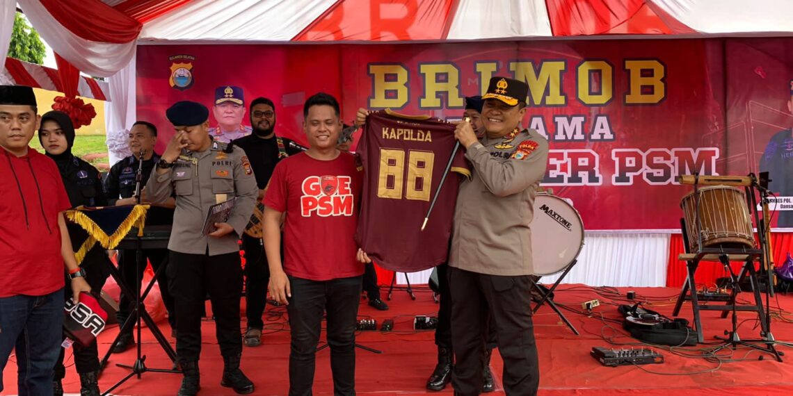 PAREPARE, MNC — Kapolda Sulsel Irjen Pol Setyo Budi Moempoeni Harso, S.H., M.Hum. bersama para PJU Polda Sulsel, berbaur bersama para suporter PSM Makassar, di Lapangan Mako Batalyon B Pelopor Satbrimob Polda Sulsel, Minggu (16/4/2023).