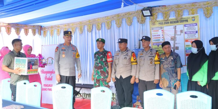 PINRANG, MNC – Kapolres Pinrang AKBP Santiaji Kartasasmita bersama Ketua Bhayangkari Ny Renzi Santiaji, mengunjungi Pos Pengamanan Operasi Ketupat 2023 di Jalan Trans Sulawesi, Kelurahan Maccorawalie, Kecamatan Watang Sawitto, Kabupaten Pinrang, Provinsi Sulawesi Selatan, Kamis (20/4/2023).