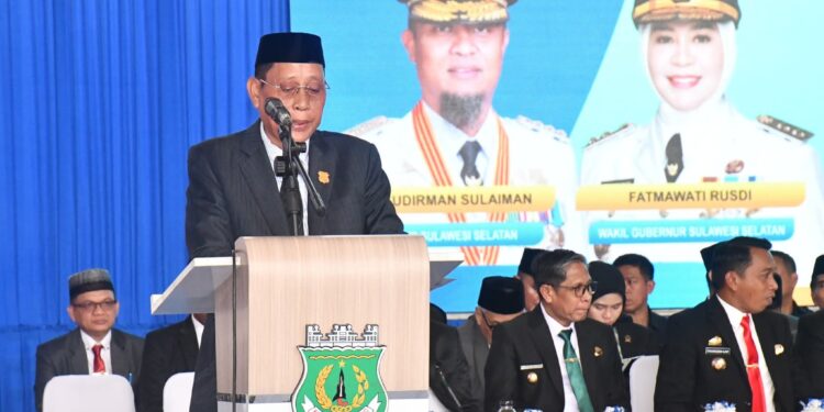 PINRANG, MERPOS — Ketua DPRD Kabupaten Pinrang, H. Nasrun Paturusi membacakan sejarah singkat Kabupaten Pinrang, pada acara puncak peringatan Hari Ulang Tahun (HUT) Kabupaten Pinrang Ke-66. Bertempat di Gedung Indoor Kantor Bupati Pinrang, Sabtu, 11 April 2026.