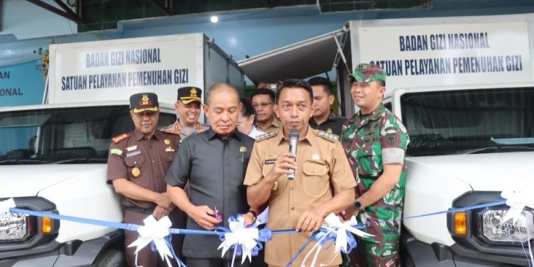 Peresmian SPPG ditandai dengan pemotongan pita dan prosesi pemberangkatan logistik oleh jajaran Forkopimda dan disaksikan sejumlah tamu undangan yang hadir.