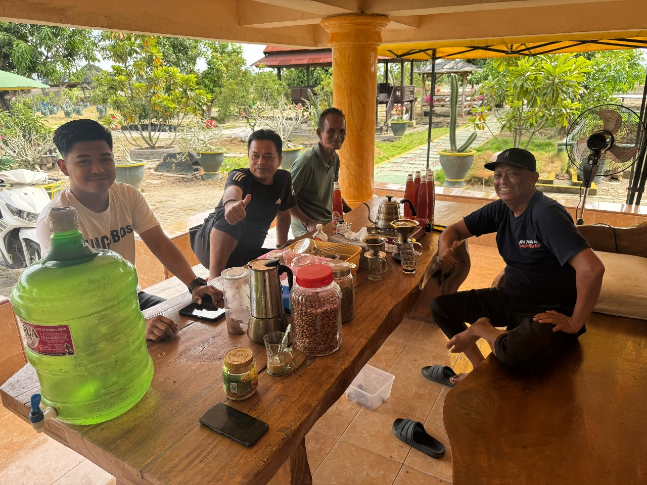 Suasana semakin meriah dengan kehadiran H. Heidir, owner Nyala Water. Keduanya menikmati kopi yang dicampur madu Pariwang, sambil berbincang akrab. H. Heidir memuji kelezatannya, sementara H. Pilli menambahkan, “Untuk yang menderita diabetes, insya Allah, kopi dan madu asli Pariwang ini bisa membantu proses penyembuhan.”
