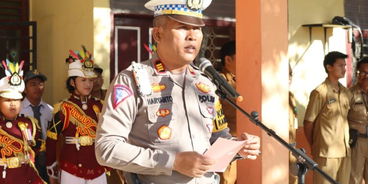 Tak sekadar berkunjung, kehadiran petugas ini sekaligus berperan sebagai pembina dalam upacara rutin pengibaran bendera merah putih yang digelar di halaman sekolah dan diikuti oleh seluruh tenaga pendidik dan siswa.