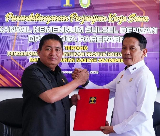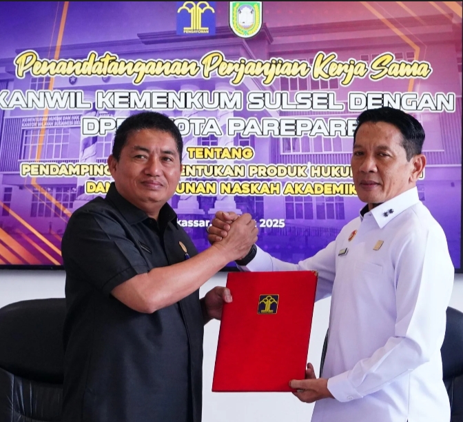 Penandatanganan kerjasama pendampingan tersebut dilakukan oleh Kakanwil Kemenkum Sulsel, Andi Basmal bersama Ketua DPRD Kota Parepare, Kaharuddin Kadir.