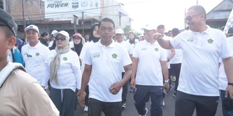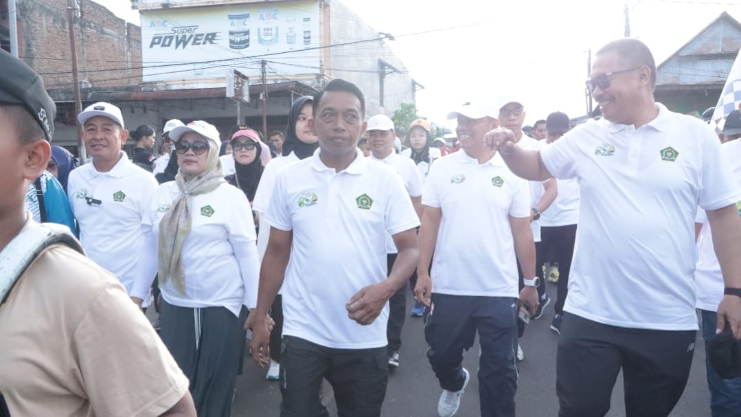 SIDRAP, MERPOS – Bupati Sidrap Syaharuddin Alrif bersama Wakil Bupati Nurkanaah berbaur dengan masyarakat mengikuti Jalan Santai Kerukunan Hari Amal Bhakti (HAB) ke-80 Kementerian Agama RI tingkat Kabupaten, Ahad (28/12/2025).