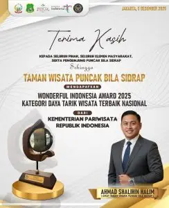 SIDRAP, MERPOS — Taman Wisata Puncak Bila (TWPB) Sidrap, Sulawesi Selatan meraih penghargaan pada even Wonderful Indonesia Awards (WIA) 2025 untuk Kategori Daya Tarik Wisata Terbaik Nasional.