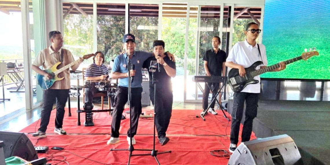 MAKASSAR, MERPOS –Di tengah kemeriahan suasana saat para golfer yang mengikuti hajatan spektakuler bertajuk Turnamen Golf Rektor Unhas Cup II 2025, memanfaatkan waktu istirahat makan siang di Restoran Padi Valley Pattalassang, Gubernur Provinsi Kalimantan Utara (Kaltara) Dr. H. Zainal Arifin Paliwang, SH, M.Hum spontan bergabung bersama grup band pengisi acara lalu ‘in action’ memainkan stik dan menggebuk drum mengiringi sang vokalis bernyanyi.