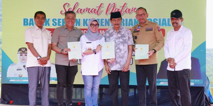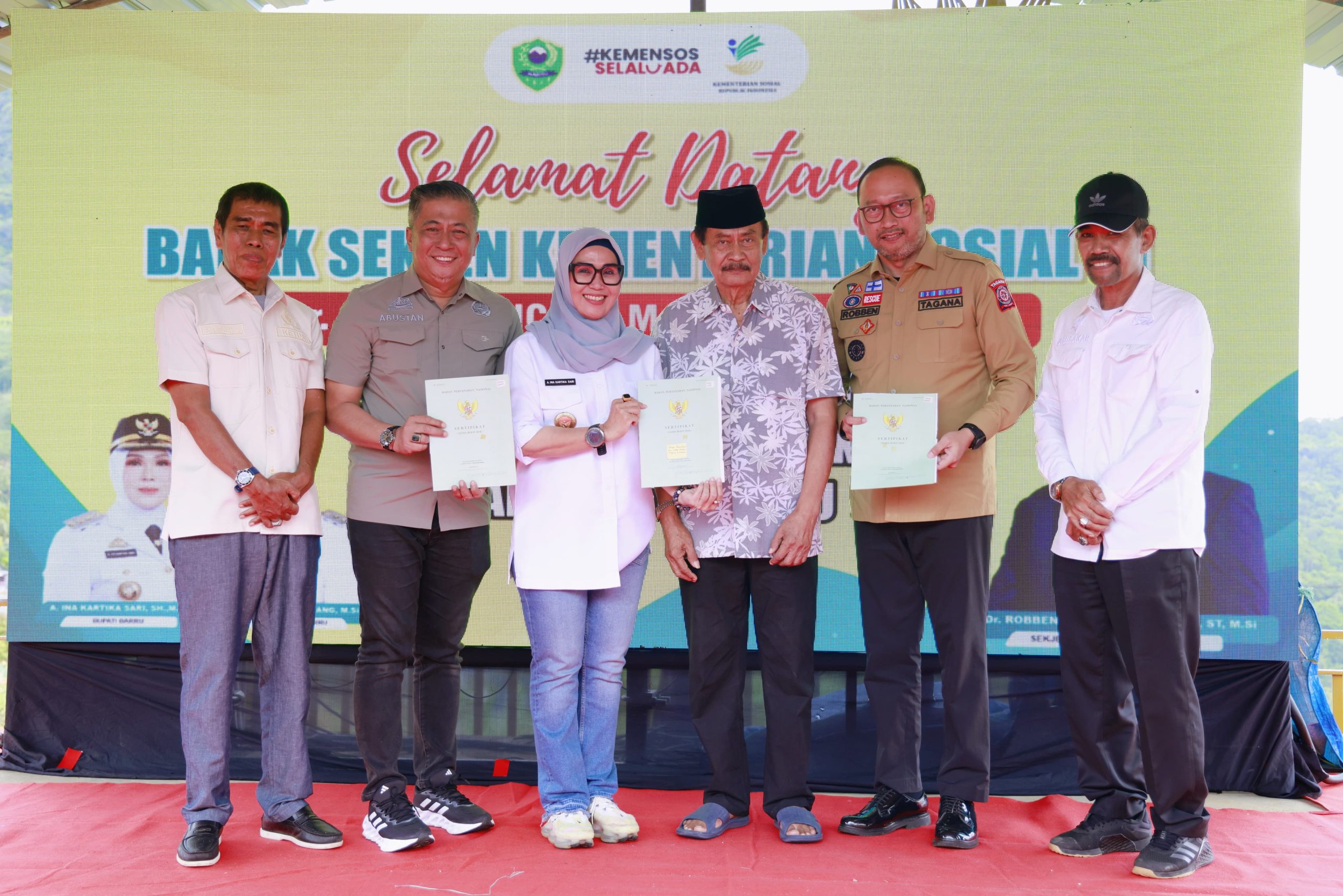 BARRU, MERPOS — Bupati Barru, Andi Ina Kartika Sari, SH., M.Si, bersama Wakil Bupati Ir. Dr. Abustan AB, M.Si, menyambut kunjungan kerja Sekretaris Jenderal Kementerian Sosial RI, Dr. Robben Rico, A.Md. LLAJ, SH., ST., M.Si, di SMP Negeri 8 Barru, Desa Harapan, Kecamatan Tanete Riaja, Kabupaten Barru, Sulawesi Selatan, Sabtu (7/6/2025).