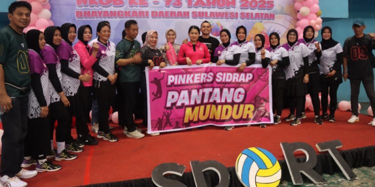 SIDRAP, MERPOS – Kapolres Sidrap Akbp Fantry Taherong menghadiri pembukaan pertandingan Bola Voli Bhayangkari Se-Daerah Sulsel. Kegiatan digelar dalam rangka memperingati Hari Kesatuan Gerak Bhayangkari (HKGB) ke-73 Tahun 2025, yang berlangsung di GOR Sudiang Kota Makassar, Selasa (15/7/25). Pagi