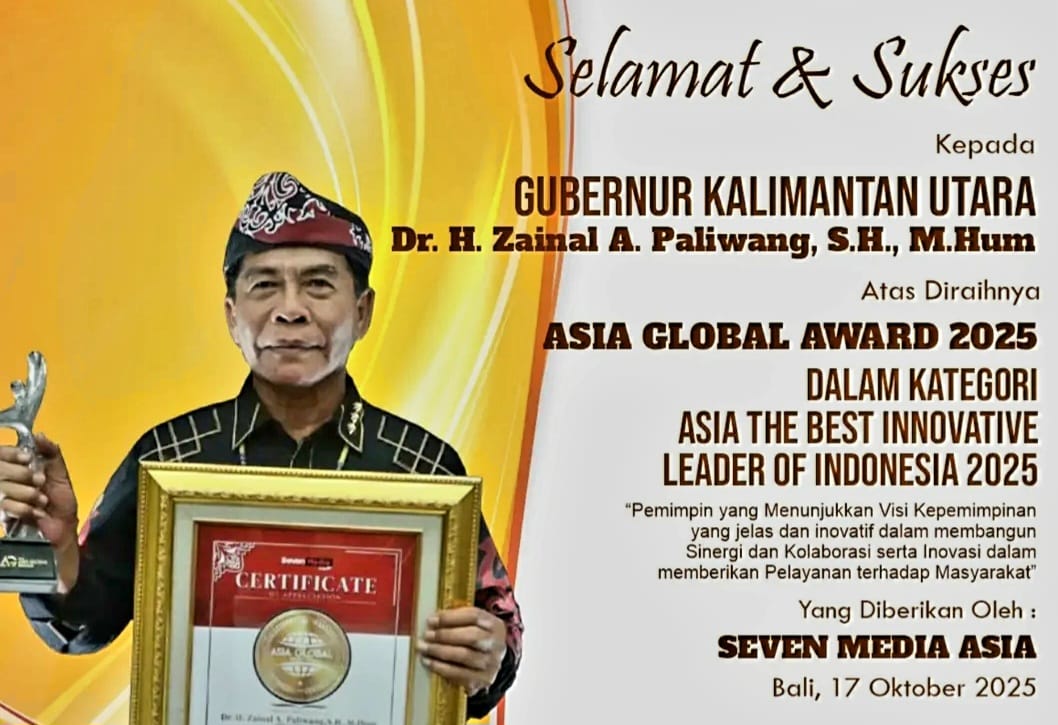 BALI, MERPOS – Prestasi gemilang yang membanggakan seluruh masyarakat Bumi Benuanta lagi-lagi ditorehkan oleh Gubernur Kalimantan Utara (Kaltara), Dr. H. Zainal Paliwang, SH, M.Hum yang kembali mendapatkan penghargaan dari Seven Media Asia dalam ajang spektakuler bertajuk “Asia Global Awards 2025” dalam kategori “Asia The Best Innovative Leader Of Indonesia 2025”.
