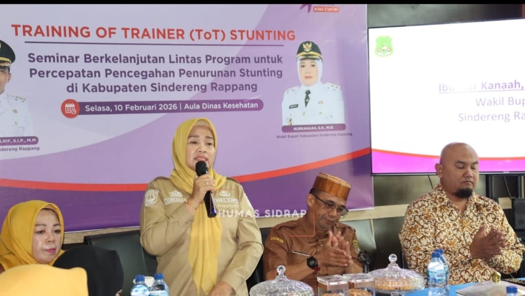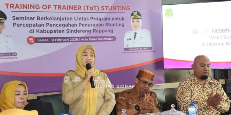 SIDRAP, MERPOS – Wakil Bupati Sidenreng Rappang (Sidrap), Nurkanaah, membuka Training of Trainers (ToT) Stunting bertajuk Seminar Berkelanjutan Lintas Program untuk Percepatan Pencegahan dan Penurunan Stunting di Kabupaten Sidrap, Selasa (10/2/2026).