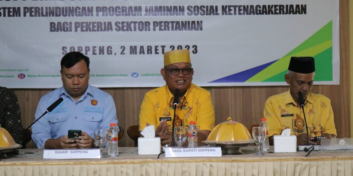 SOPPENG, MNC — Wakil Bupati Soppeng Ir. Lutfi Halide, MP membuka Sosialisasi Peraturan Bupati Soppeng Nomor 5 Tahun 2023, tentang Sistem Perlindungan Jaminan Sosial Ketenagakerjaan bari Pekerja Sektor Pertanian, di Hark Café Malaka Kabupaten Soppeng, Kamis (2/3/2023).